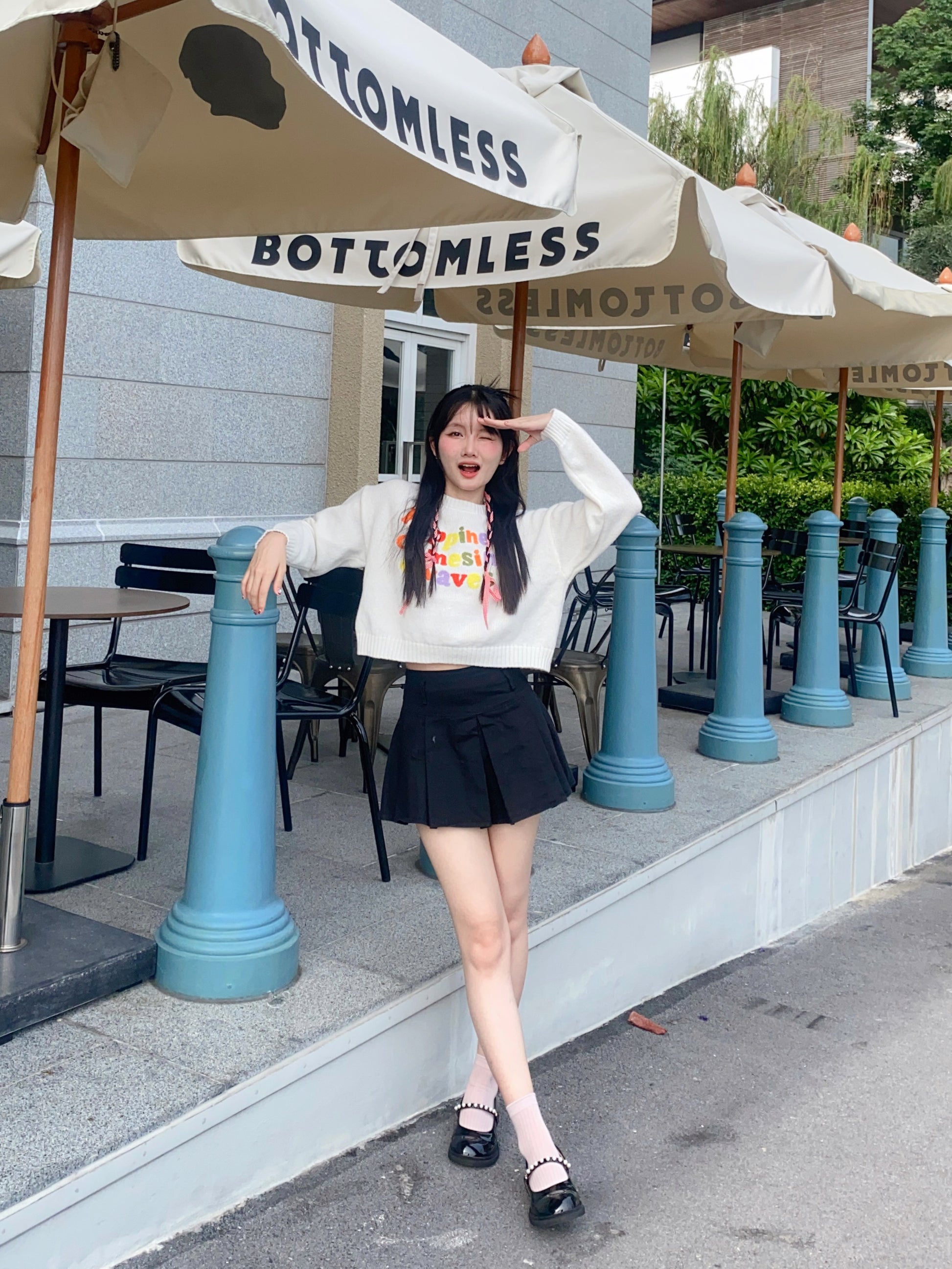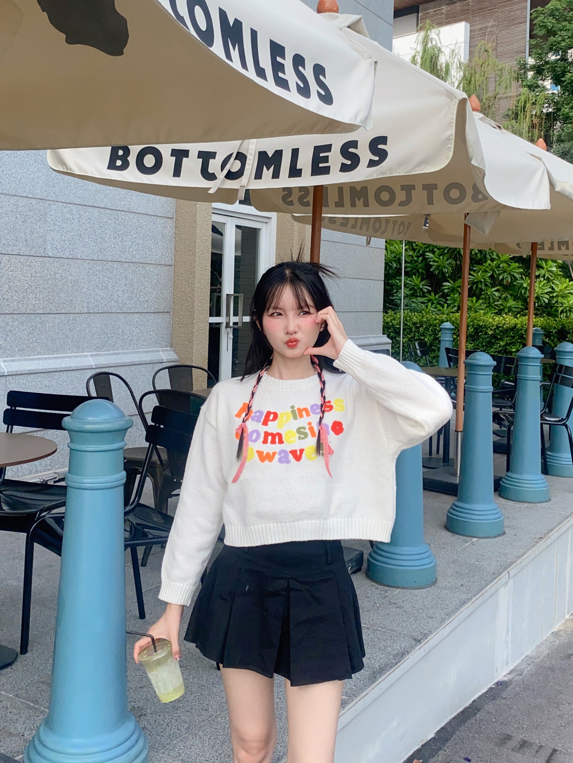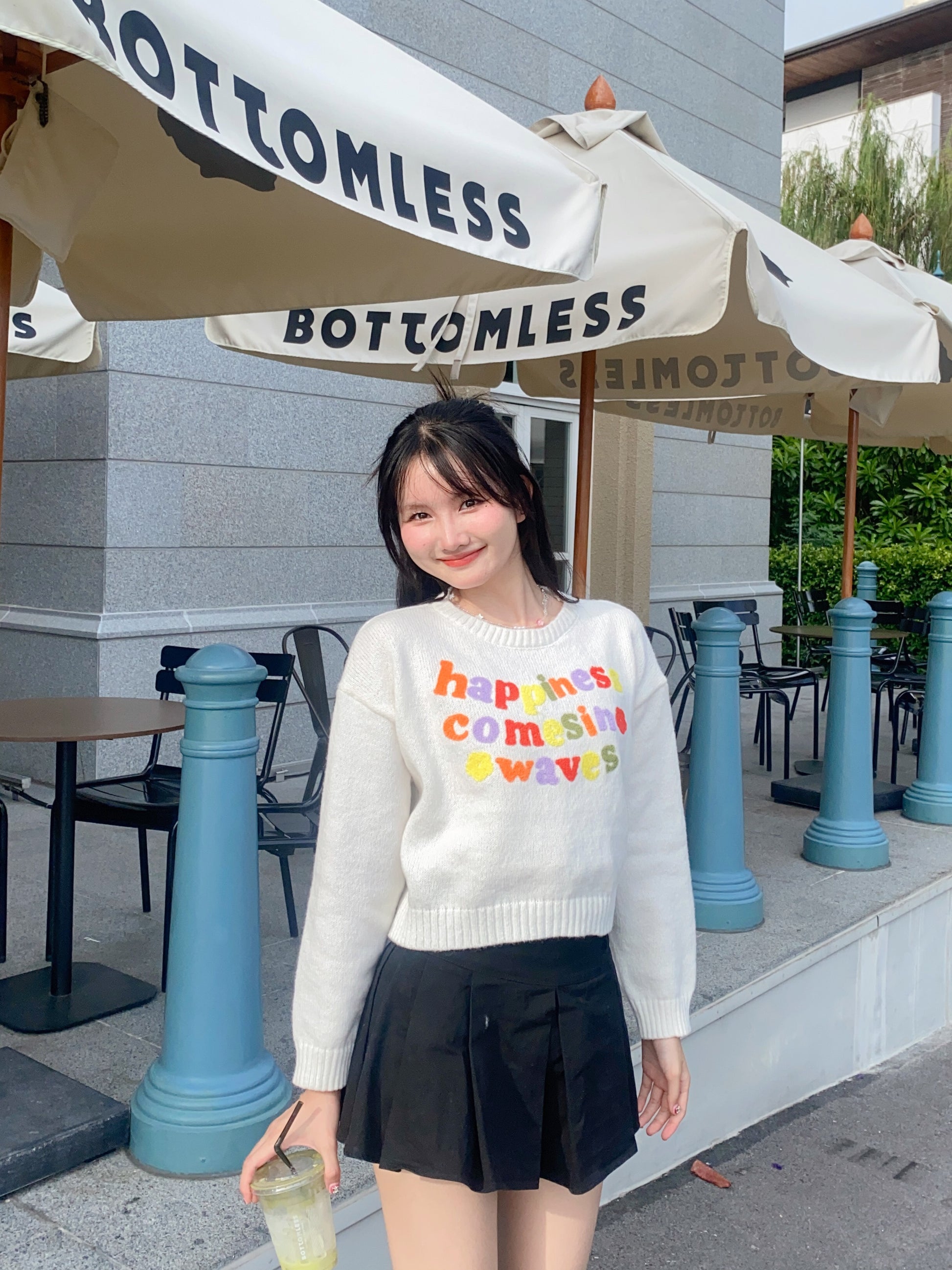 - Design: Crewneck sweater with colorful text, relaxed drop-shoulder cut, and ribbed cuffs and hem