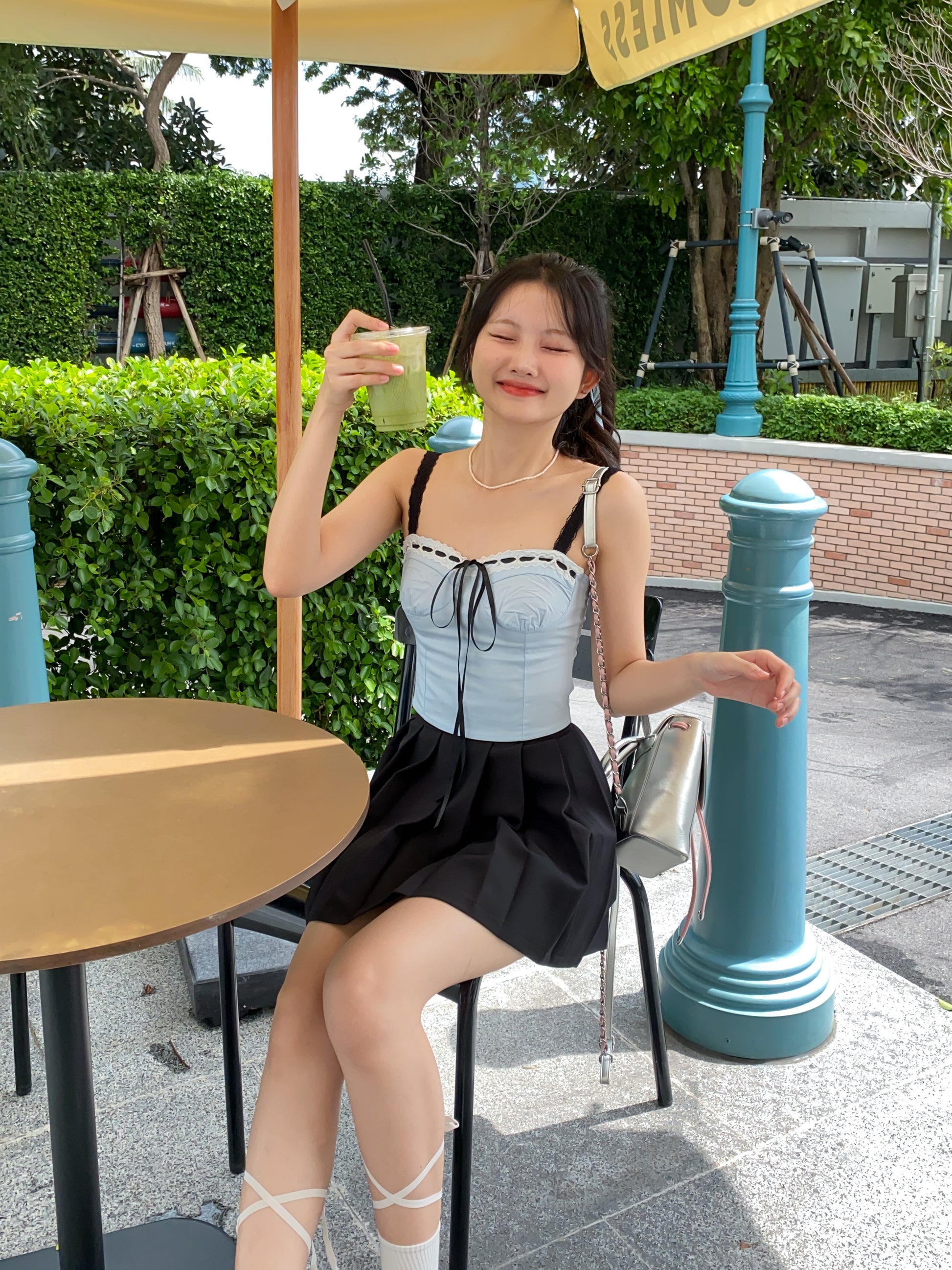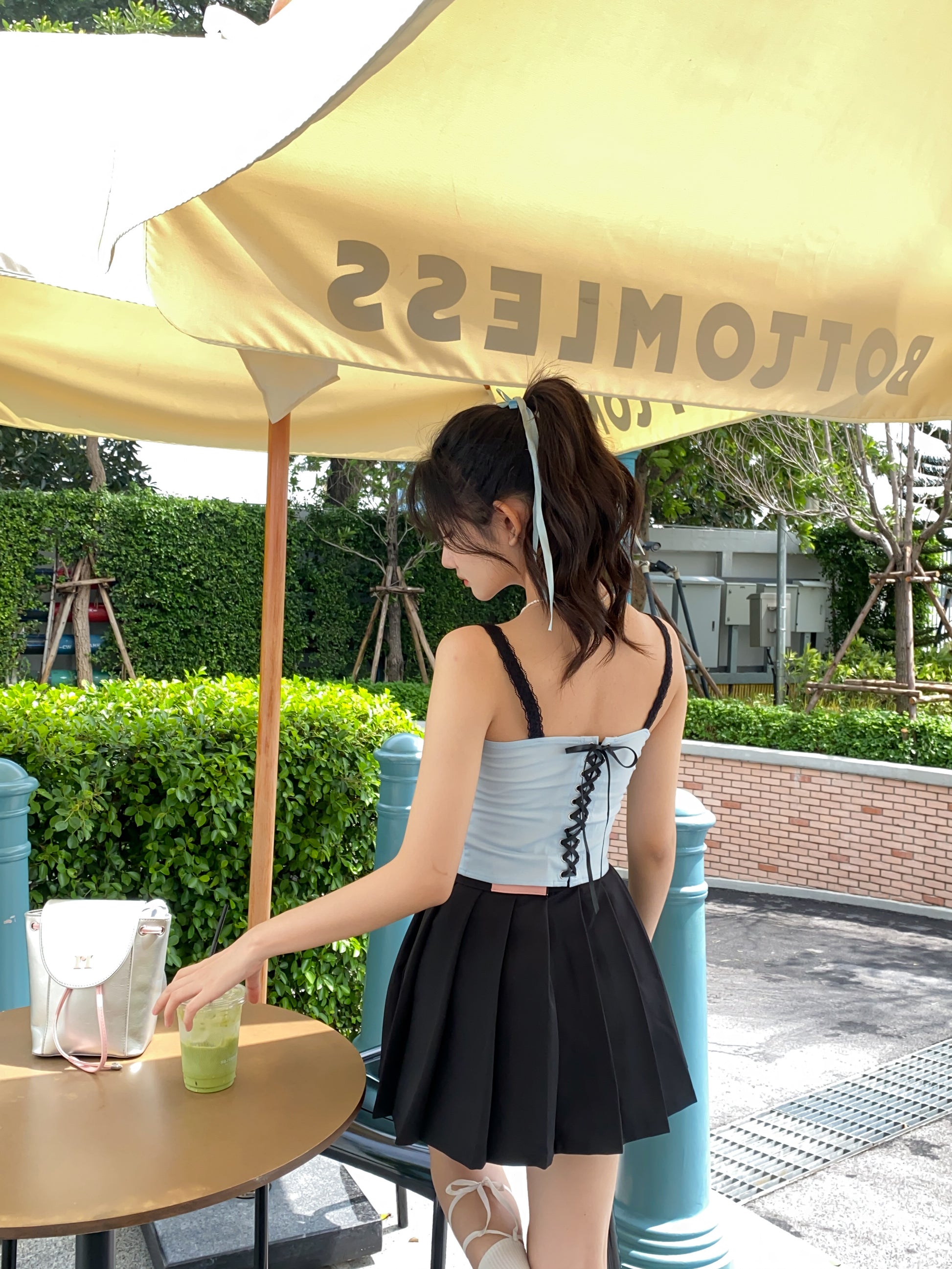 - Design: Corset-inspired crop top with ruched bust, lace trim, and ribbon tie at the center