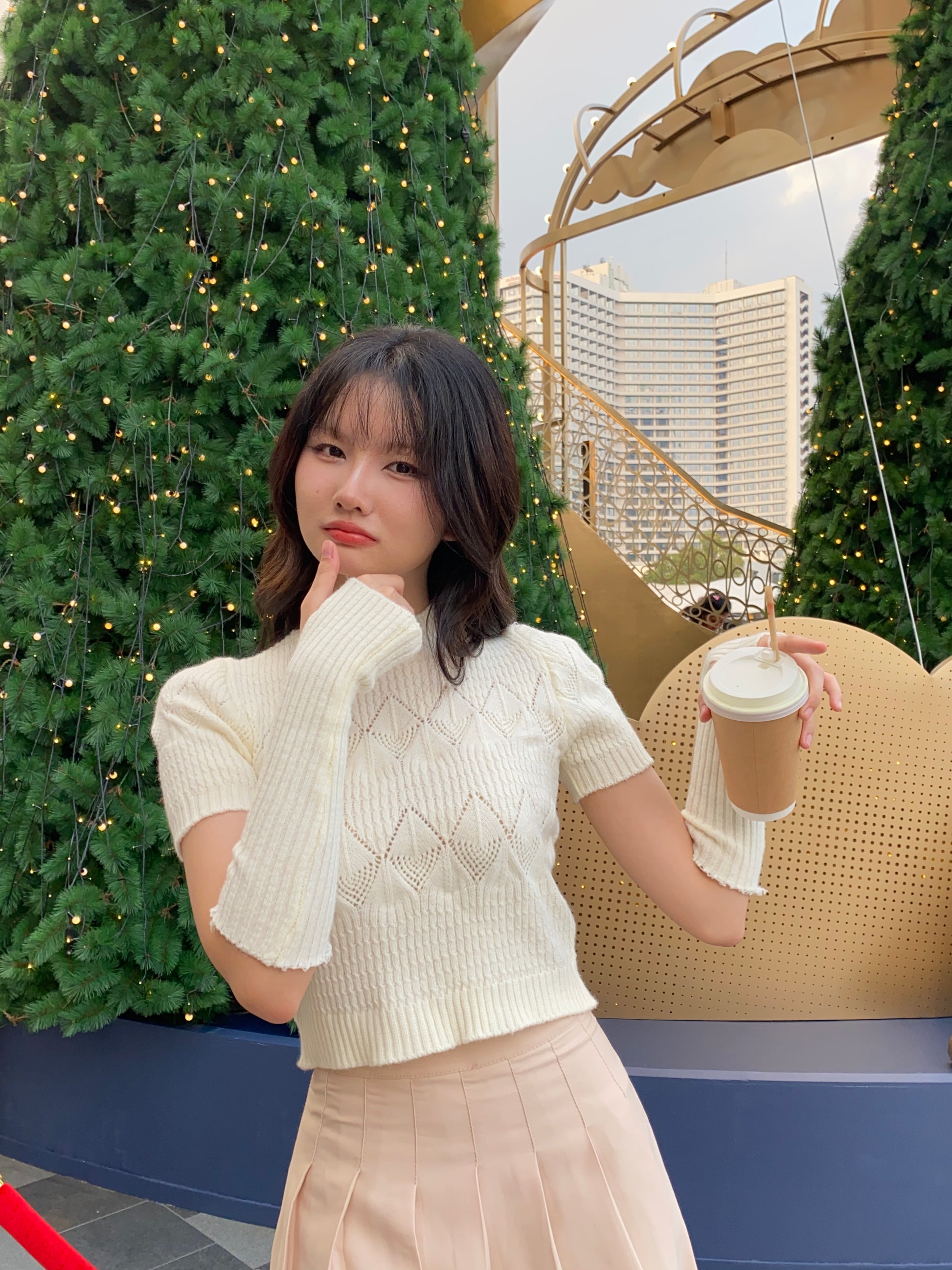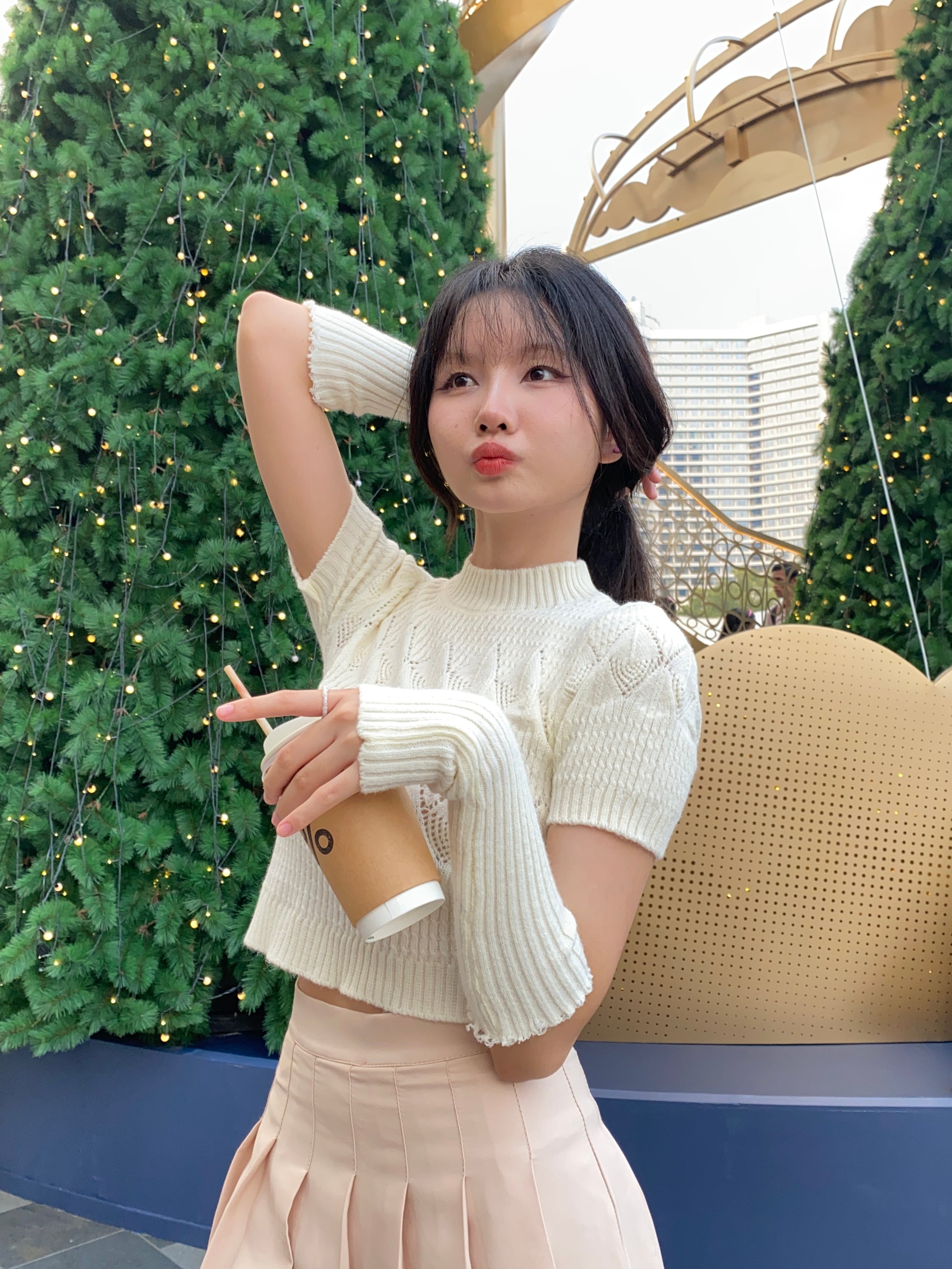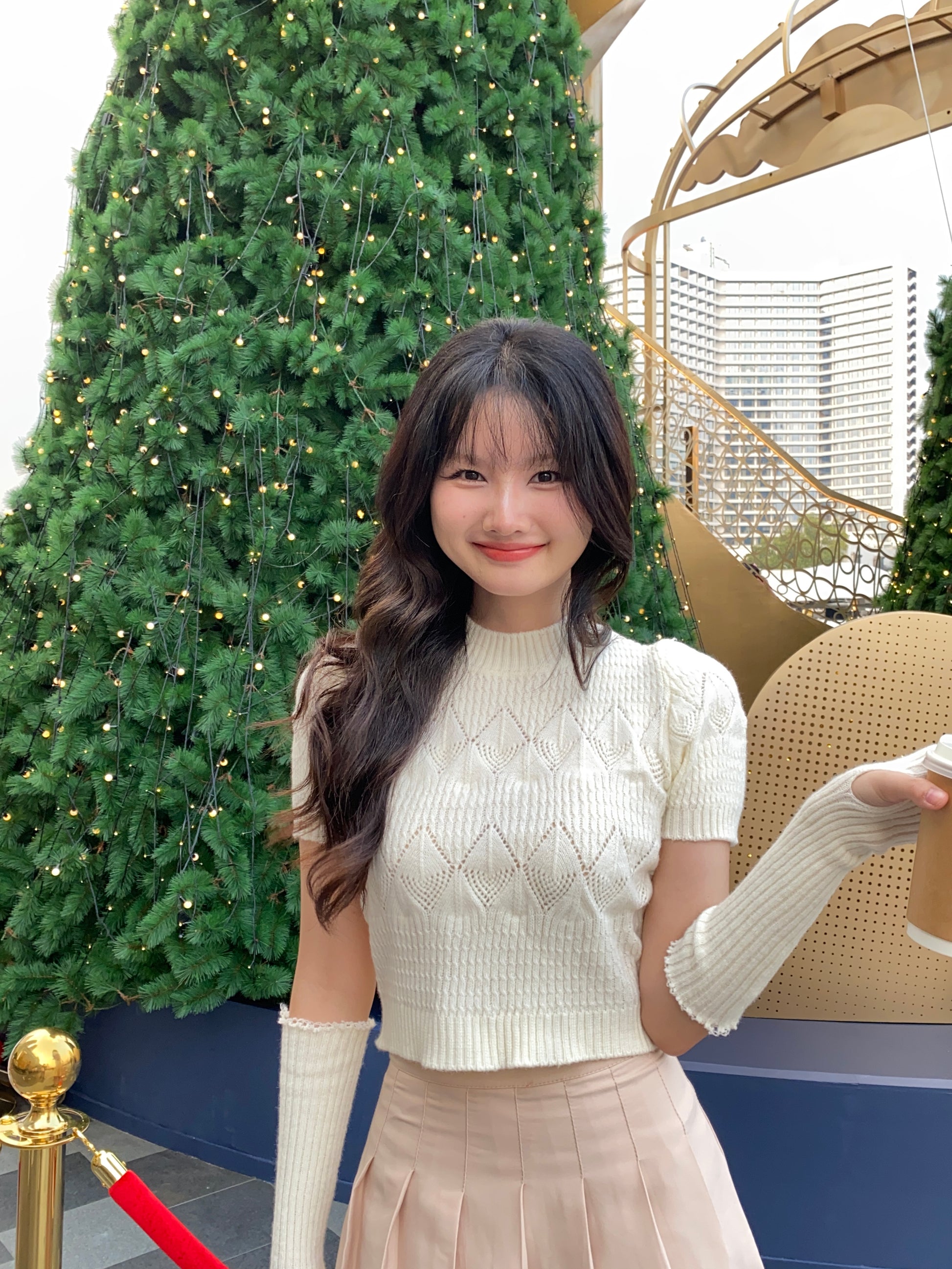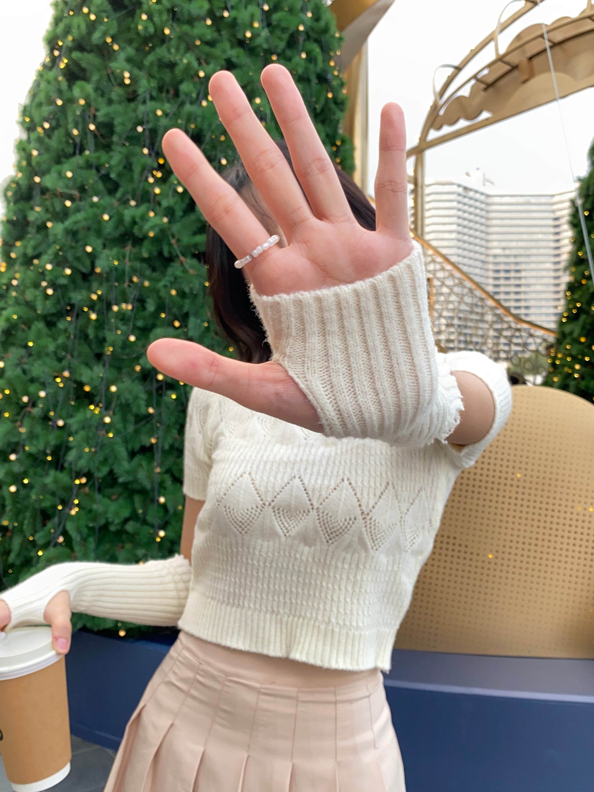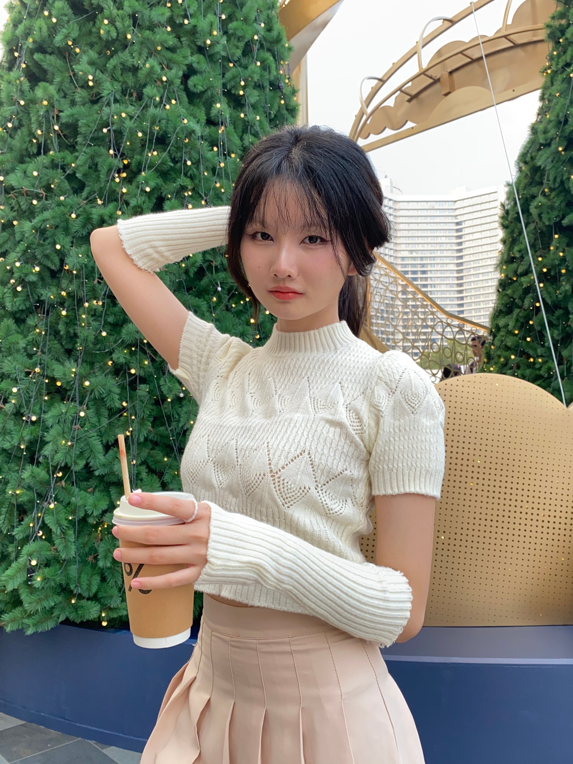 The Vanilla Top is a soft and charming must-have. Featuring a delicate diamond-knit pattern and a matching set of cozy arm warmers, this cropped top brings a playful yet elegant vibe to any outfit. Pair it with pleated skirts, jeans, or layer under jackets for the cutest, comfiest looks.