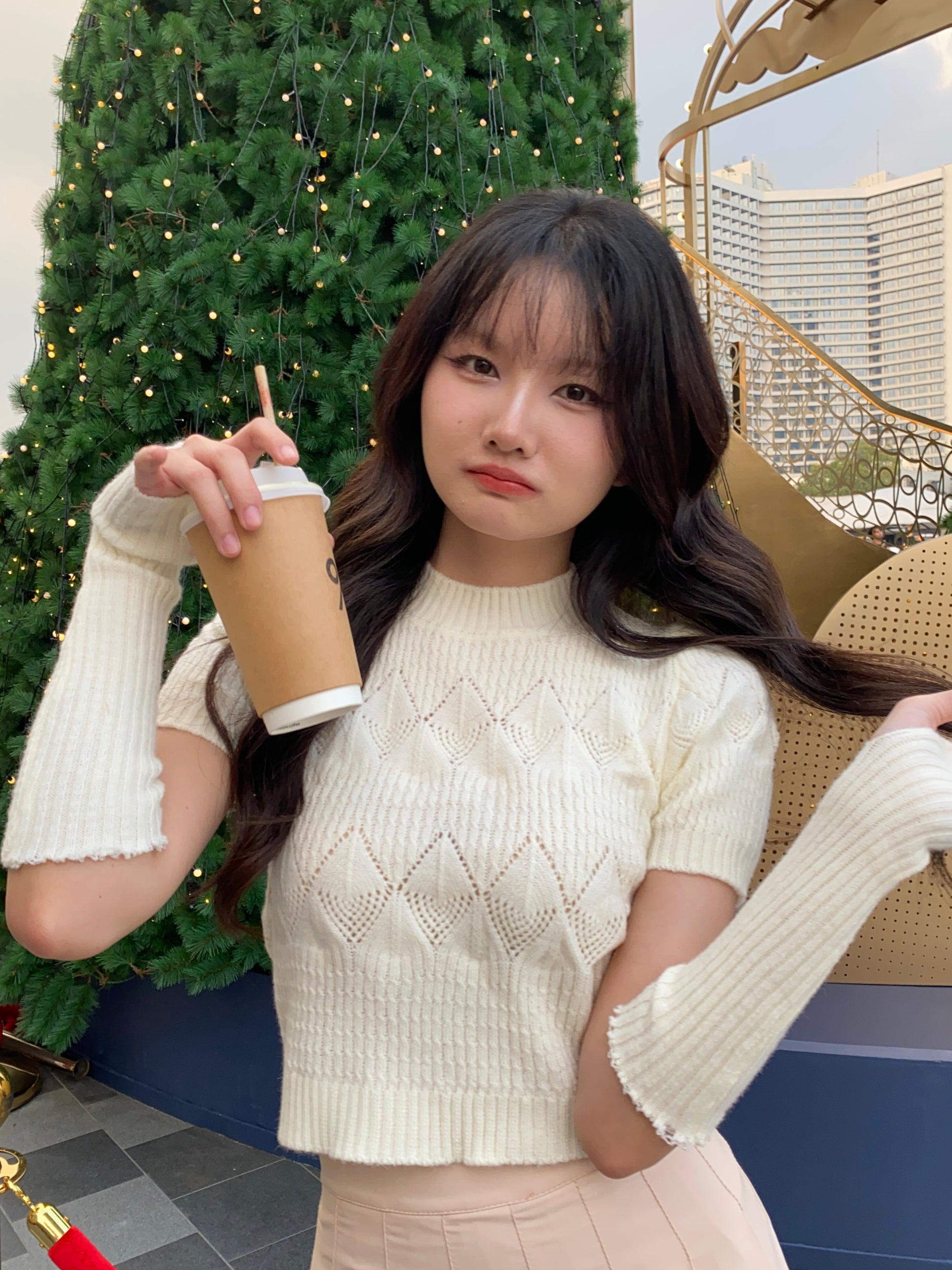 • Design: Short-sleeve knit crop top with diamond-pattern cut-out details and matching knit arm warmers